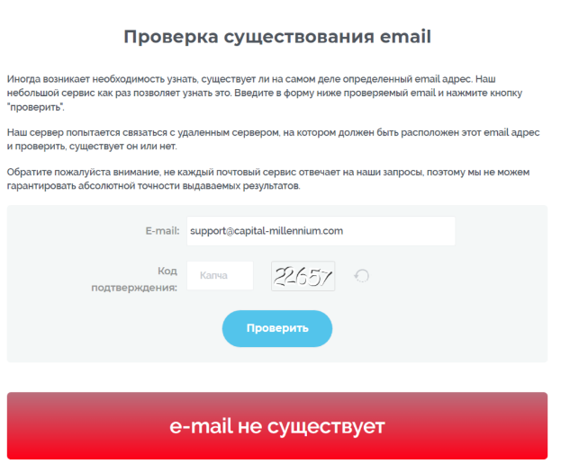 Веб-сайтта көрсетілген электронды пошта (support@capital-millennium.com) серьезді саналатын мұғалімдерді қамтамасыз етеді. Электронды пошта мекенжайларын тексеру қызметі арқылы алынған деректер бойынша, ол әлі де мұндағып сауытты. Шын және сенімді брокерлер өздерінің клиенттерімен тексерілетін және жұмыс істеу мекенжайлары арқылы байланыс іске асырады.