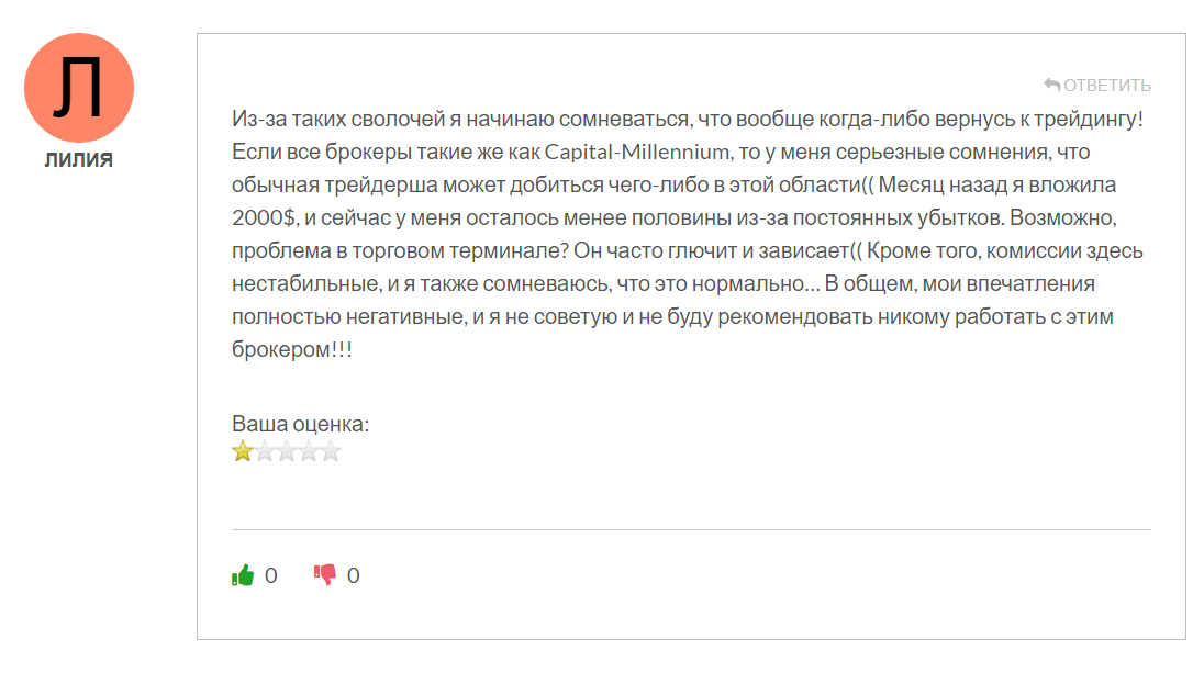 Форумдар мен әлеуметтік желілердегі Capital Millennium туралы пікірлер олардың жоғалмасы көздеріне байланысатынды айтып қана. Көптеген клиенттер олармен болған негативті тәжірибелерін пайдаланушылармен бөліседі. Олар брокерлердің өздерін жалдамайтын және клиенттерді ақшасыз қалдыратынін, сонымен үшін ақшасыз қалдыратындығын сипаттайды.