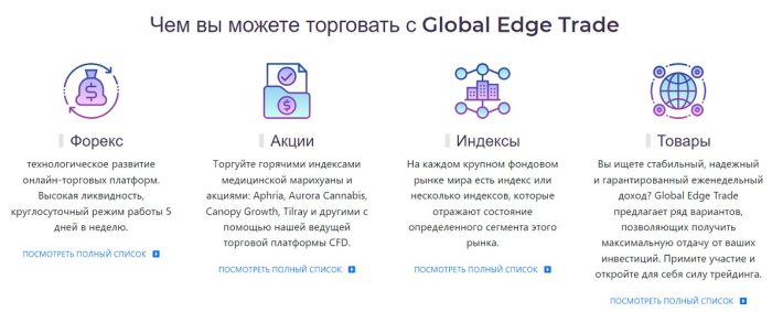 Компания "Global Edge Trade" құрылтылушылары, Форекс рынға байланысты, олар клиенттерге сауда жасау мен популярлық активтер мен құралдарға доступ береді деген дайындалдыру бар. Жалпы лжеброкердің ұстаз порталында, компания клиенттерге олардың потенциалын ашу мен рынокты қалай жұмыс жасауы мен не жарты жаттығын түсіндіруге көмек көрсететін, қамтылған және көрсетілген сауда аймағын ұсынуына кепілдік береді. Бірақ сайтта көрсетілген көрсетулер меніңдеттер сайтта көрсетілген көрсетулерден кейін платформаны жасау жатырдың көзқарасынан кейінді дайындалдырудан өте дала.