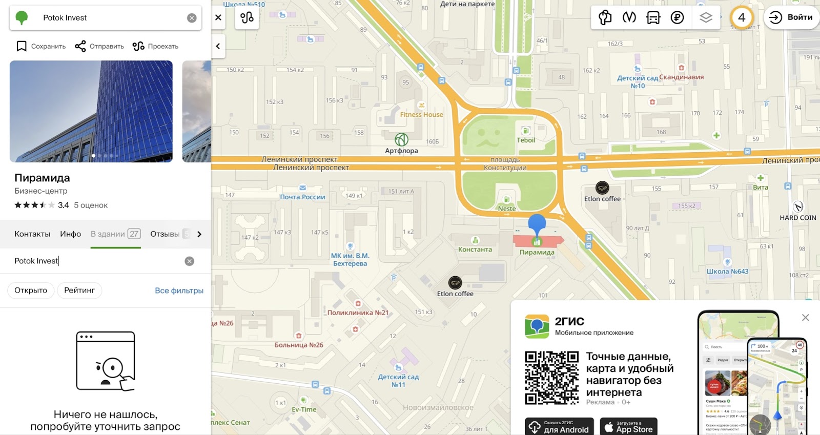 Контактті деректермен платформада жеткізу үшін кейбір мәліметтер көрсетілмейді. Пайдаланушыларға тек электрондық пошта арқылы байланысу ұсынылады. Телефондық қолдау көрсетілмеген. Potok Invest осыны Ресей компаниясы ретінде санайды, Санкт-Петербургда тіркелген деп айтып отырады. Мына деректерді 2ГИС арқылы тексергенде, көрсетілген мекен-жайда көптеген кәпірлі бизнес-орталық бар. Бірақ Potok Invest офисі осы үйде жоқ. Пайдаланушылар отзывтерде берілген координаттар бойынша іздейді, жасаушыны байланыстыру үшін абсолютты жарамсыз дегенін растайды.