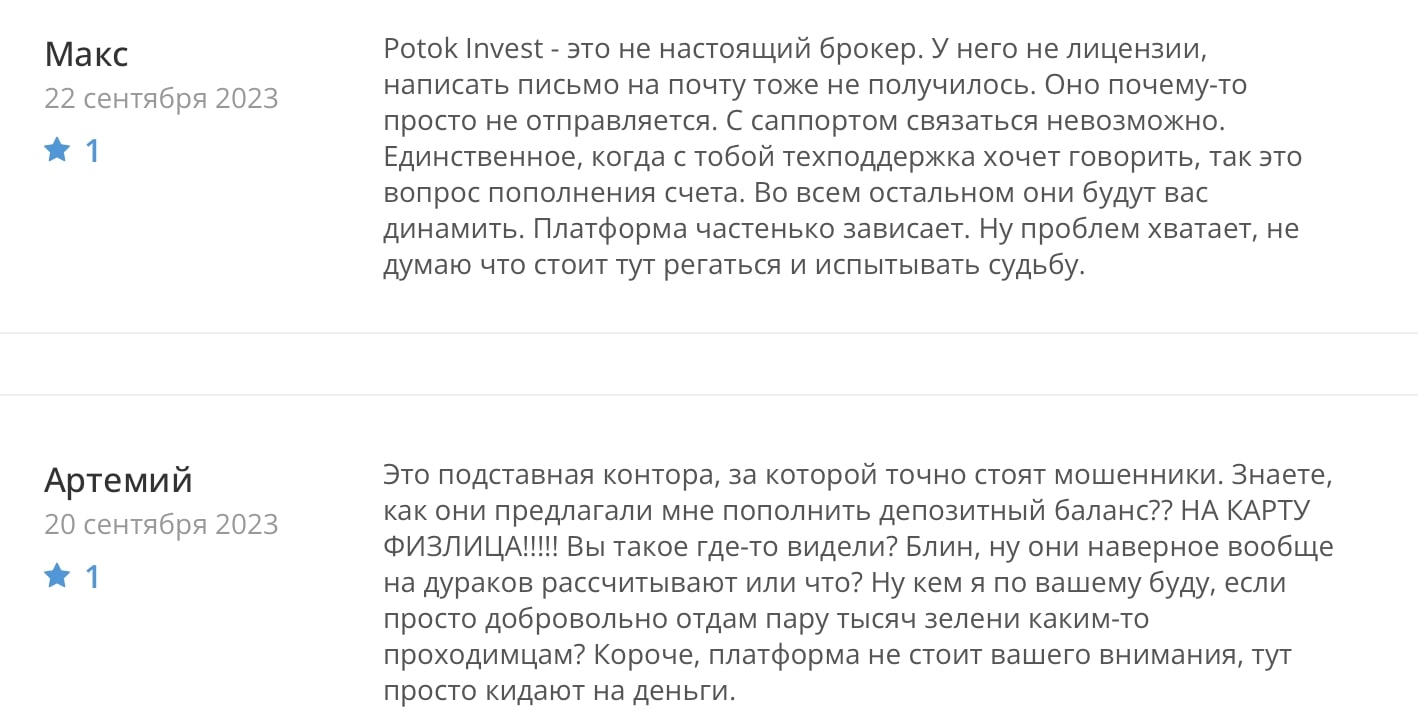 Обзорды жазған уақытта Potok Invest туралы пікірлер көп емес, бірақ бірінші бақыт негативті аймақтықты барын айтады. Бұл организацияның бастауынан бастап, ол жауапкершілікті жөндеу және алушының алғашқы мақсаттарын орындауға дайын болмауын айтады.