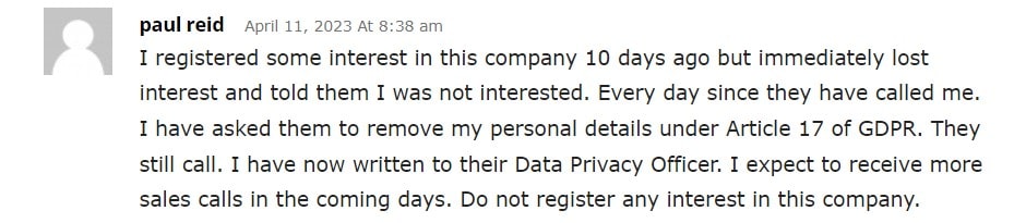 "Мен өте жақты түсінген тауарлармен танысқандым, 10 күн бұрын, бірақ одан кейін мен оны жоқ деп айттым және сізге хабарлама жасағанымнан бері мені өкінішке алдым. Ал олар мені өкіншіліктерімді жояу үшін GDPR 17-шаруашы статьясы бойынша оларға сұрайтын болатын бір таңдауды қалдырып қойдым. Олар кейінде меніге хабарлама жасайтынымдай жалғандайтып жатқызды. Ағымда мен персоналды деректерді қору қамтамасыз ету бойынша олардың қызметкеріне хат жаздым. Мен жакындаған күндері олардан жаңа қоңыраулар келетінін күтемін. Бұл компанияға жанеуге деген күнәнізді көрсетмеуіңізді сүрмейтініз."