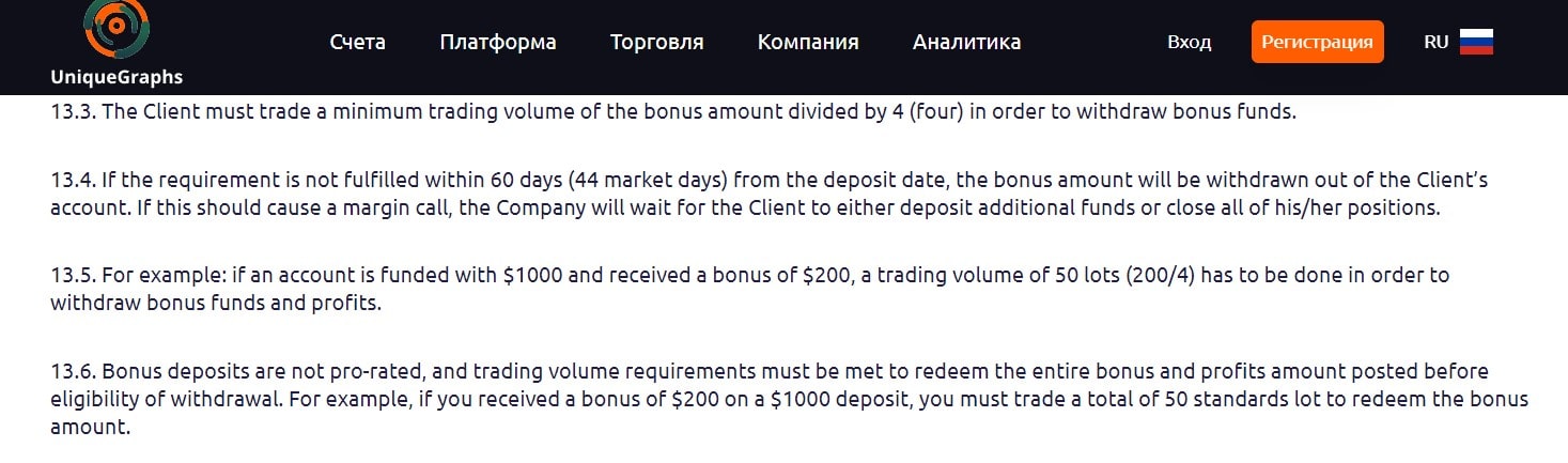 Соңғы нұсқасына арналған қайта қарауға особый назар көрсеттік, себебі UniqueGraphs өздері қолданушыларды рынға шығармағанын айтуды. Егер сізде 1:30-ден жоғары ливеридж көрсетілген болса, онда біздің сіздің жеке кабинетіңіздегі барлық сандар "суретке орналған" дегенін біліңіз. Содан тағы, біз спрэдтер, комиссиялар және минималды депозит туралы ақпаратты көрсетпедік. Обзорларды жасау тәжірибесіне сәйкес, аферисттер өздерінің "Буратино"ның маңыздылығын алғашқыда тексереді, содан кейін тек оған сандарды айтуды бастайды.